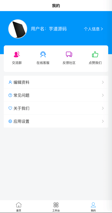 目前已经实现登录、我的、工作台、编辑资料、头像修改、密码修改、常见问题、关于我们等基础功能。
