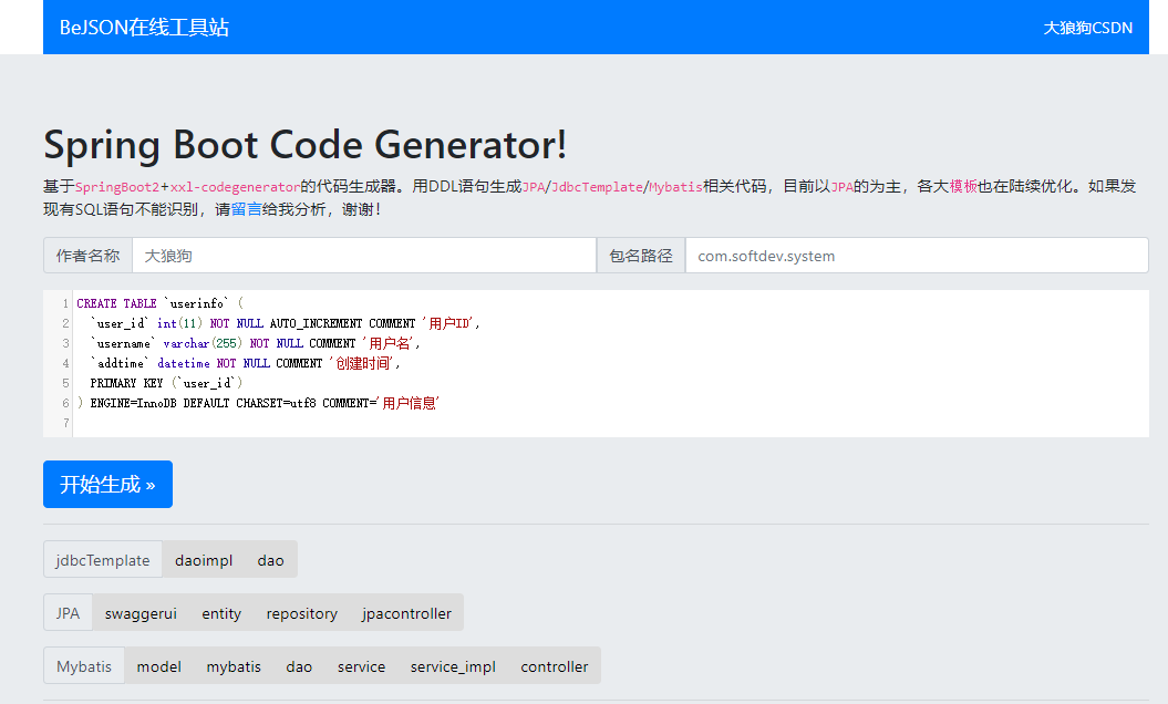 基于SpringBoot2+xxl-codegenerator的代码生成器。用DDL语句生成JPA/JdbcTemplate/Mybatis相关代码,目前以JPA的为主,各大模板也在陆续优化。