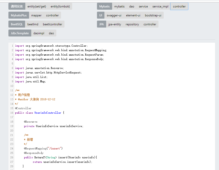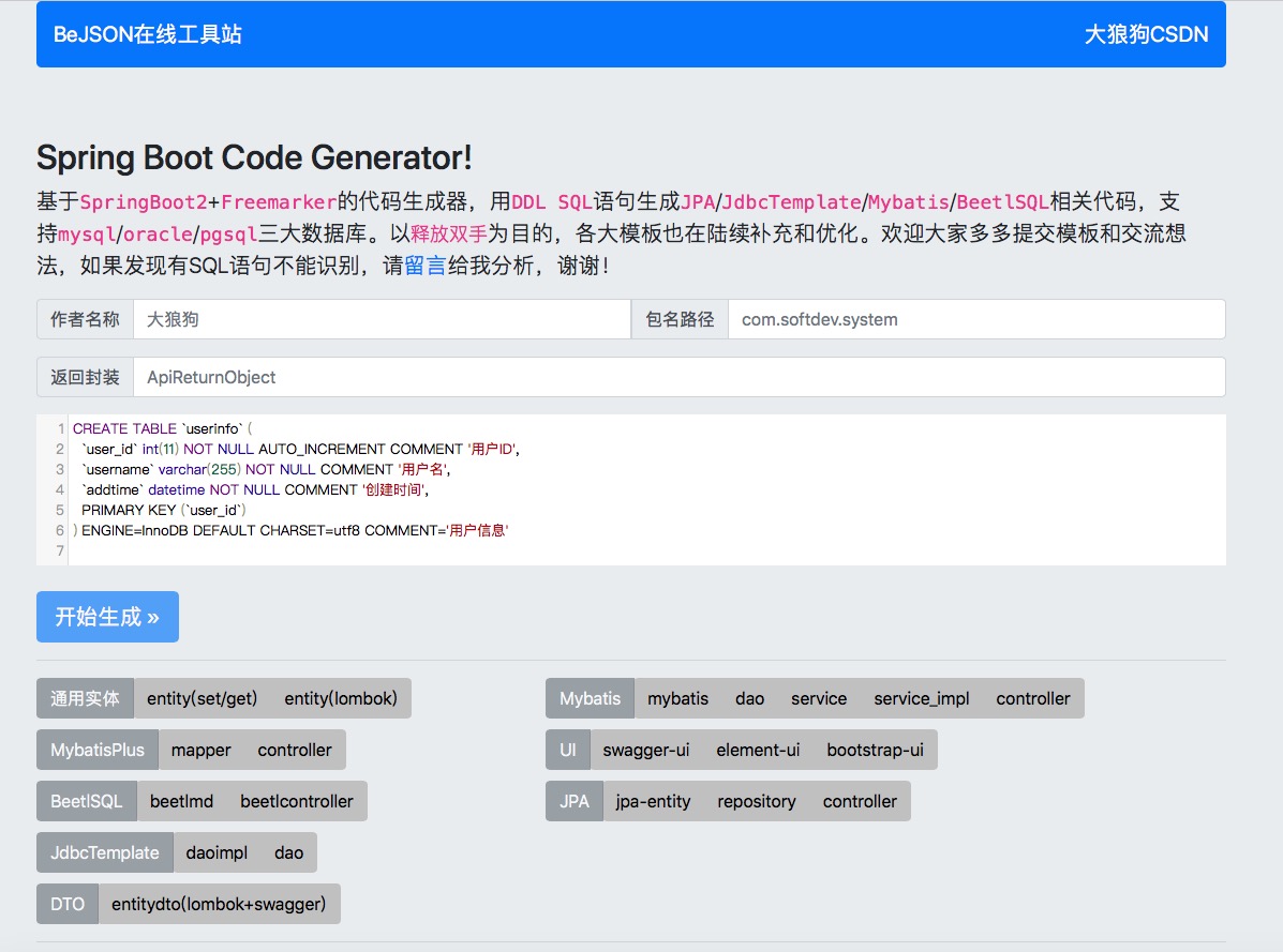 又名大狼狗代码生成器,基于SpringBoot2+Freemarker的JAVA代码生成器,以释放双手为目的,支持mysql/oracle/pgsql三大数据库, 用DDL-SQL语句生成JPA/JdbcTemplate/Mybatis/MybatisPlus/BeetlSQL等相关代码.