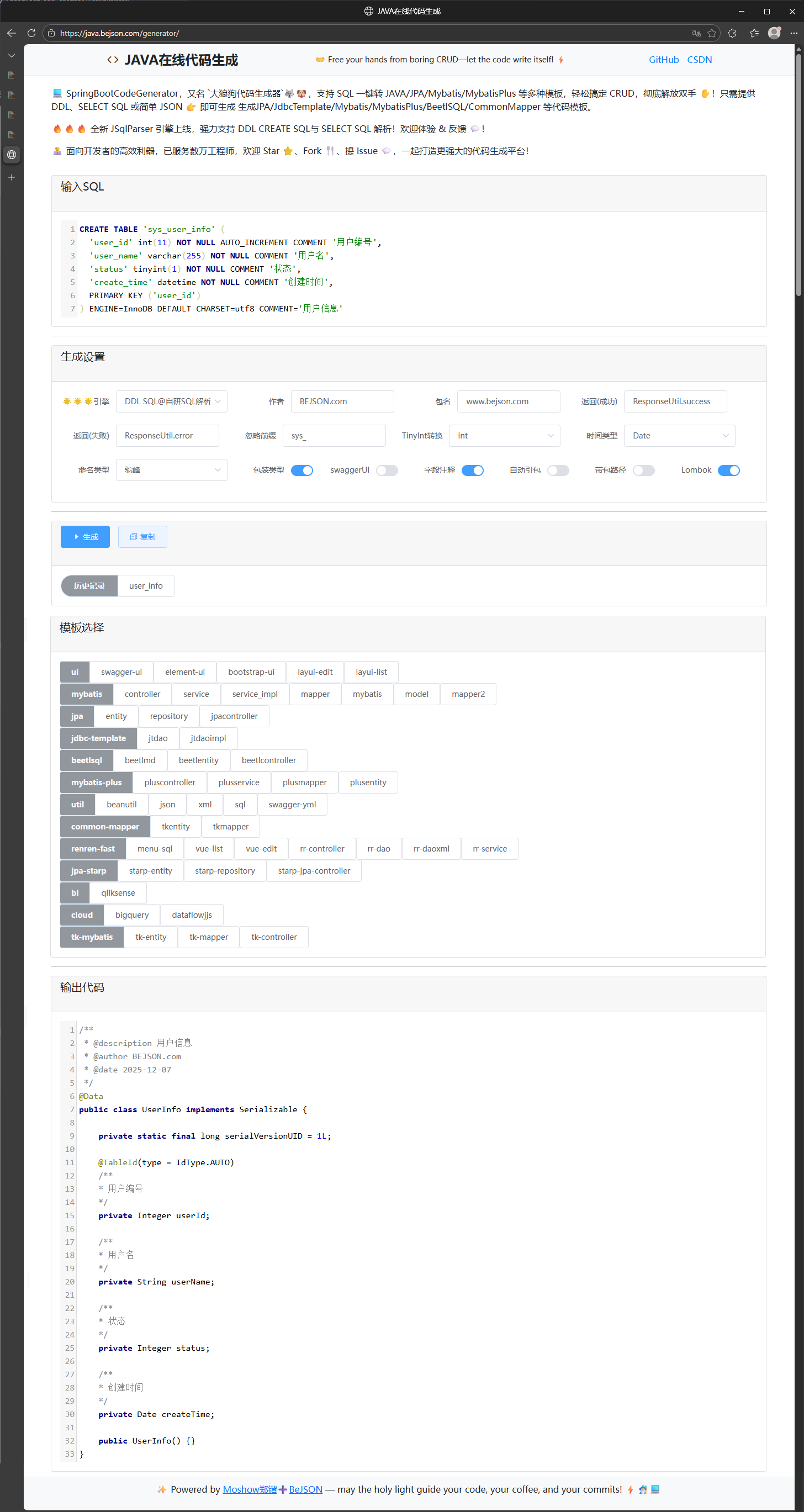又名Java代码生成器JAVA在线代码生成平台sql转java大狼狗代码生成器mybatis在线生成器SQL转Java JPA、MYBATIS实现类代码生成平台