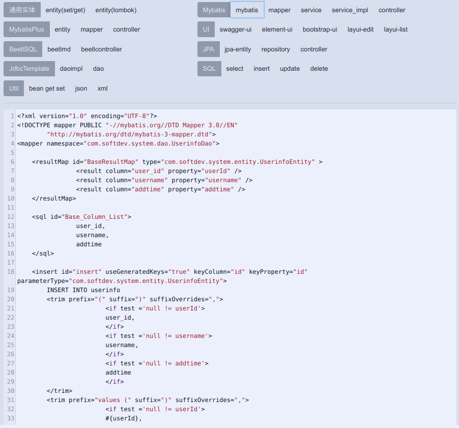 1.添加tinyint类型转换(感谢@lixiliang&@liujiansgit的Suggestion) 2.添加一键复制功能(感谢@gaohanghang的Suggestion) 3.Mybatis的insert增加keyProperty="id"用于返回自增id(感谢@88888888888888888888的Suggestion) 4.优化date类型的支持(感谢@SteveLsf的反馈) 5.其他一些优化. |