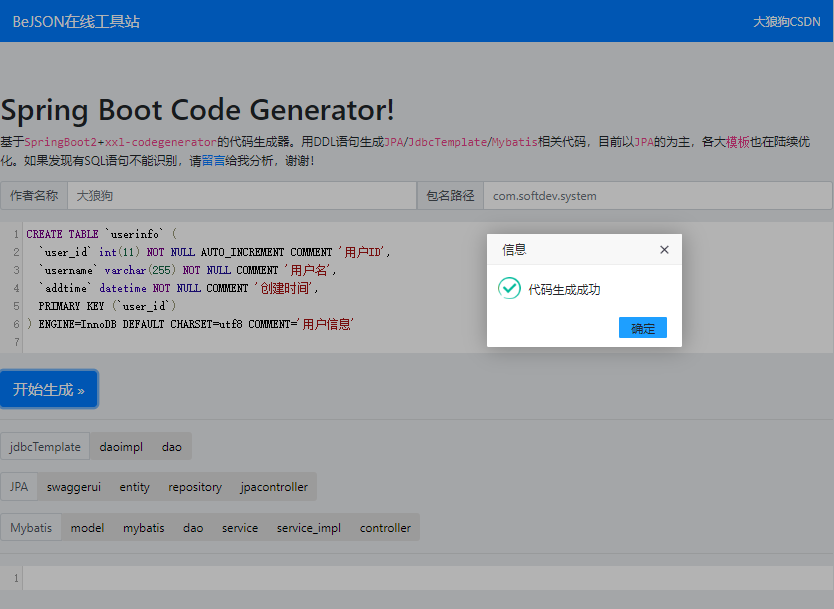 又名大狼狗代码生成器,基于SpringBoot2+Freemarker的JAVA代码生成器,以释放双手为目的,支持mysql/oracle/pgsql三大数据库, 用DDL-SQL语句生成JPA/JdbcTemplate/Mybatis/MybatisPlus/BeetlSQL等相关代码.
