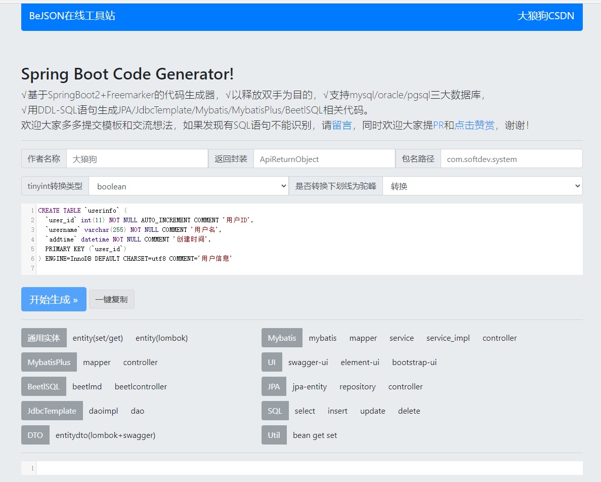 又名大狼狗代码生成器,基于SpringBoot2+Freemarker的JAVA代码生成器,以释放双手为目的,支持mysql/oracle/pgsql三大数据库, 用DDL-SQL语句生成JPA/JdbcTemplate/Mybatis/MybatisPlus/BeetlSQL等相关代码.