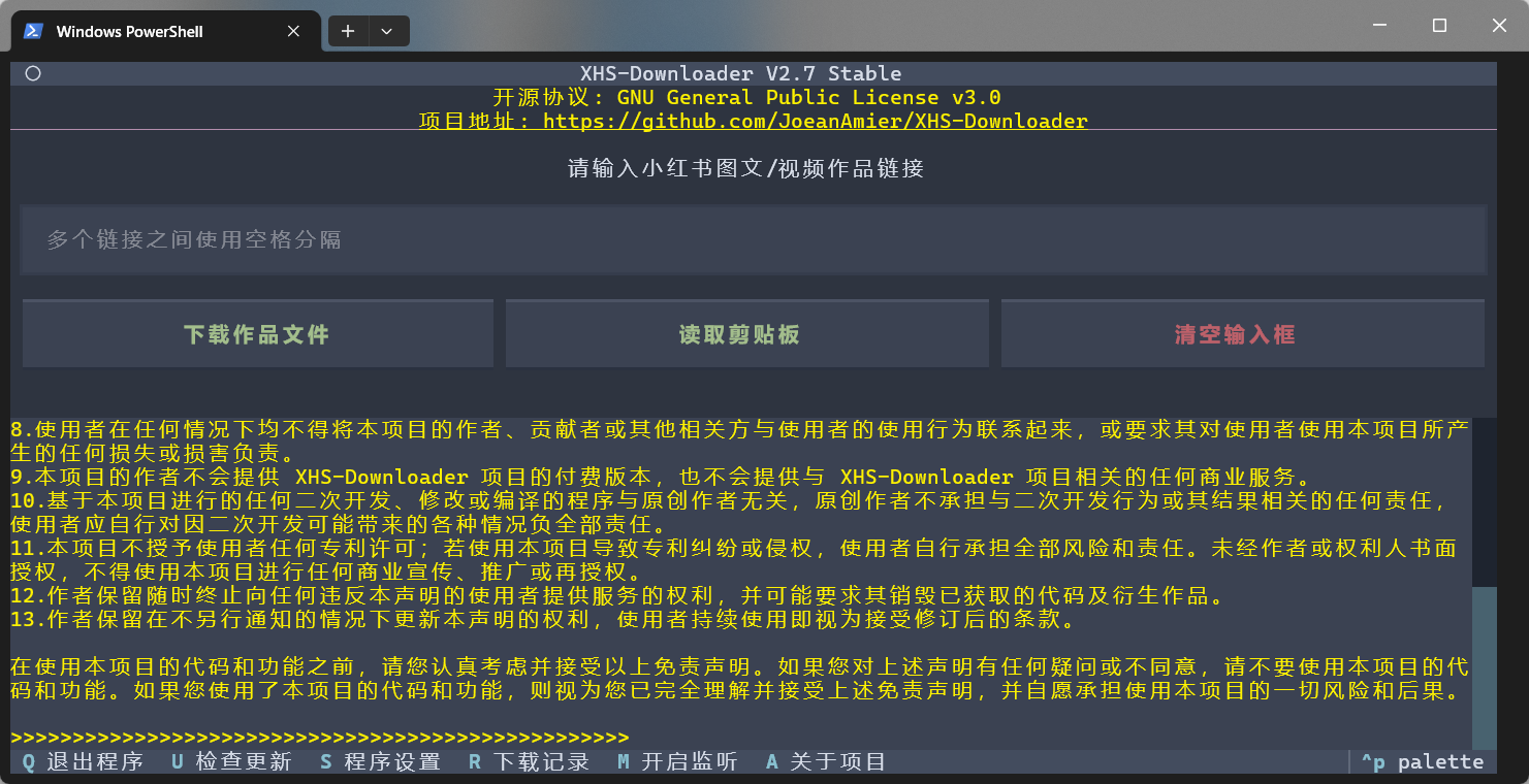 python .\main.py或者python main.py命令启动 XHS-Downloader - 运行